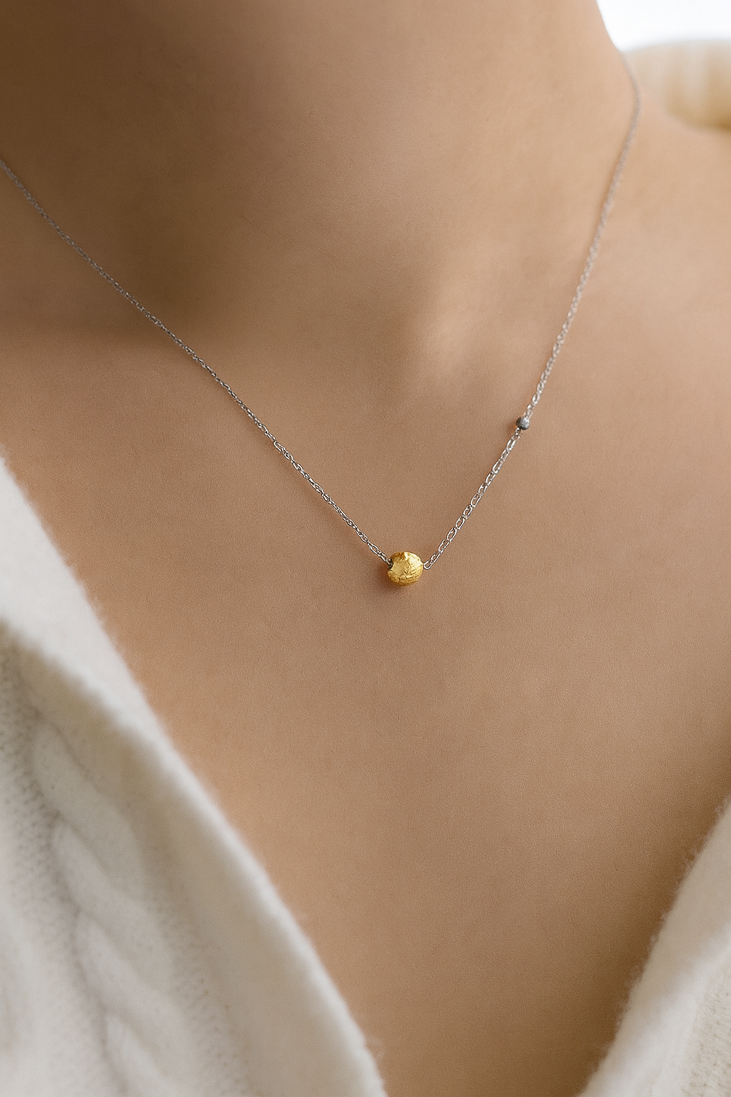 La Lune embodies refined elegance, merging minimalist design with a modern twist. Crafted from stainless steel, this exquisite piece features a large, gold round pendant threaded directly through the chain, evoking the smooth, continuous glow of the moon. Complementing it is a smaller silver pendant, adding a touch of contrast and sophistication.